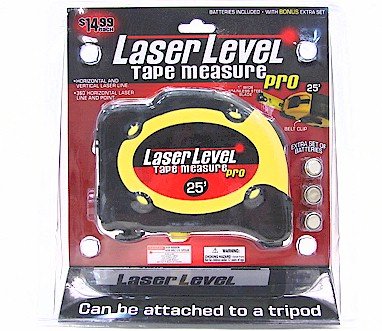 This Laser Level Tape Measure Pro is perfect for the handyman around the house! The Laser Level Tape Measure Pro is actually a 2 in 1 tool as it is a laser level and a tape measure. The laser level can make both horizontal and vertical laser lines. The bottom features a tripod attachment for the most accurate results. It can actually go 360 degrees around, so you can level a whole room in one shot. The laser level can even be placed in the corner of a room to level shelves or speaker stands. Laser level can change size also - On the bottom you will find adjustable magnetic legs. That's only the half of it!! The tape measure part of the laser level extends to 25 feet with a 1 inch wide stainless steel blade. The laser level tape measure also features a belt clip so you can add it to a tool belt. Batteries are INCLUDED and you get a bonus extra set!! So the next time you walk past that crooked picture in the dining room, think of the laser level tape measure pro and get those nails straight this time around!Combination Professional Laser Level and Tape Measure Specification